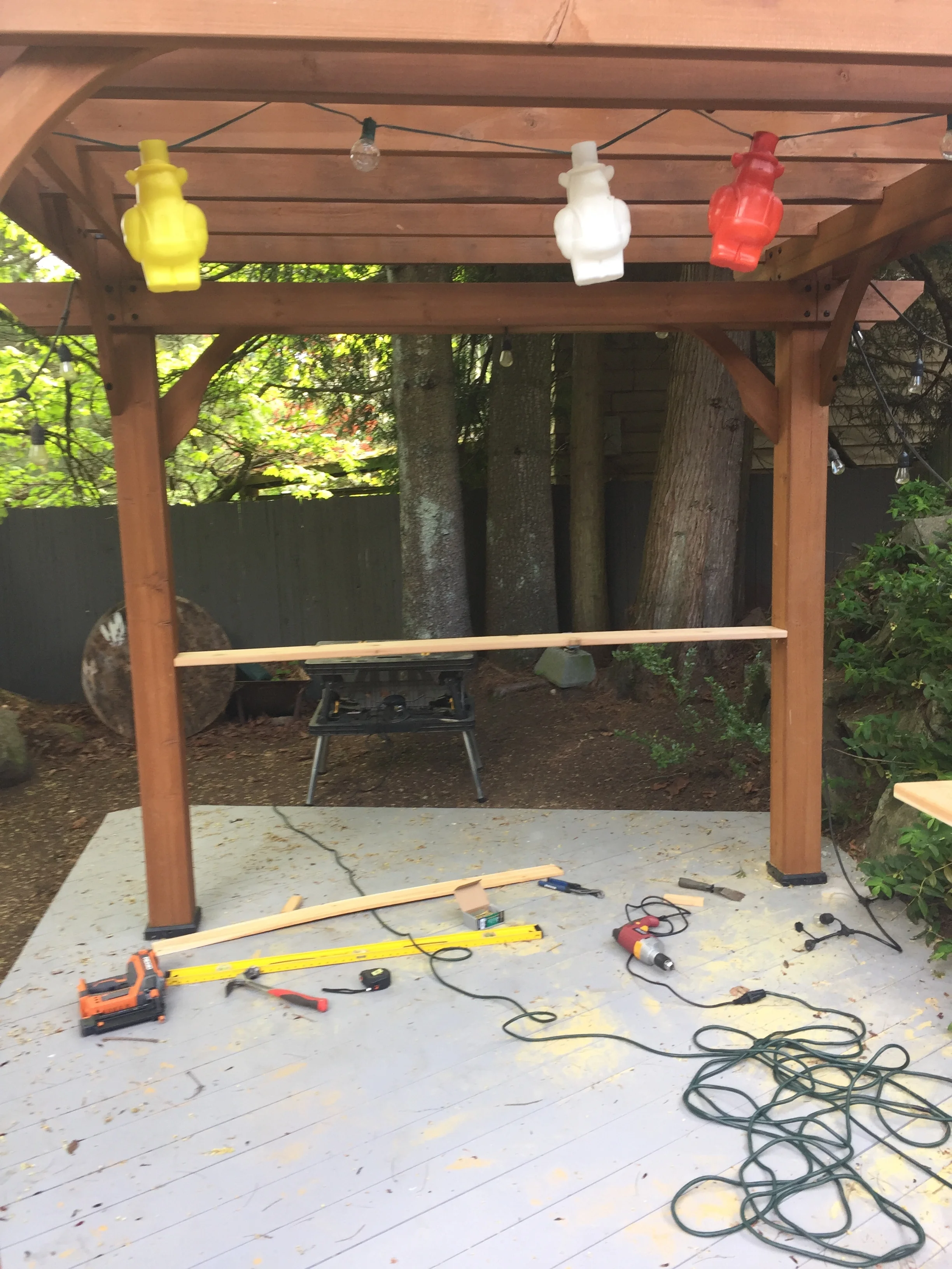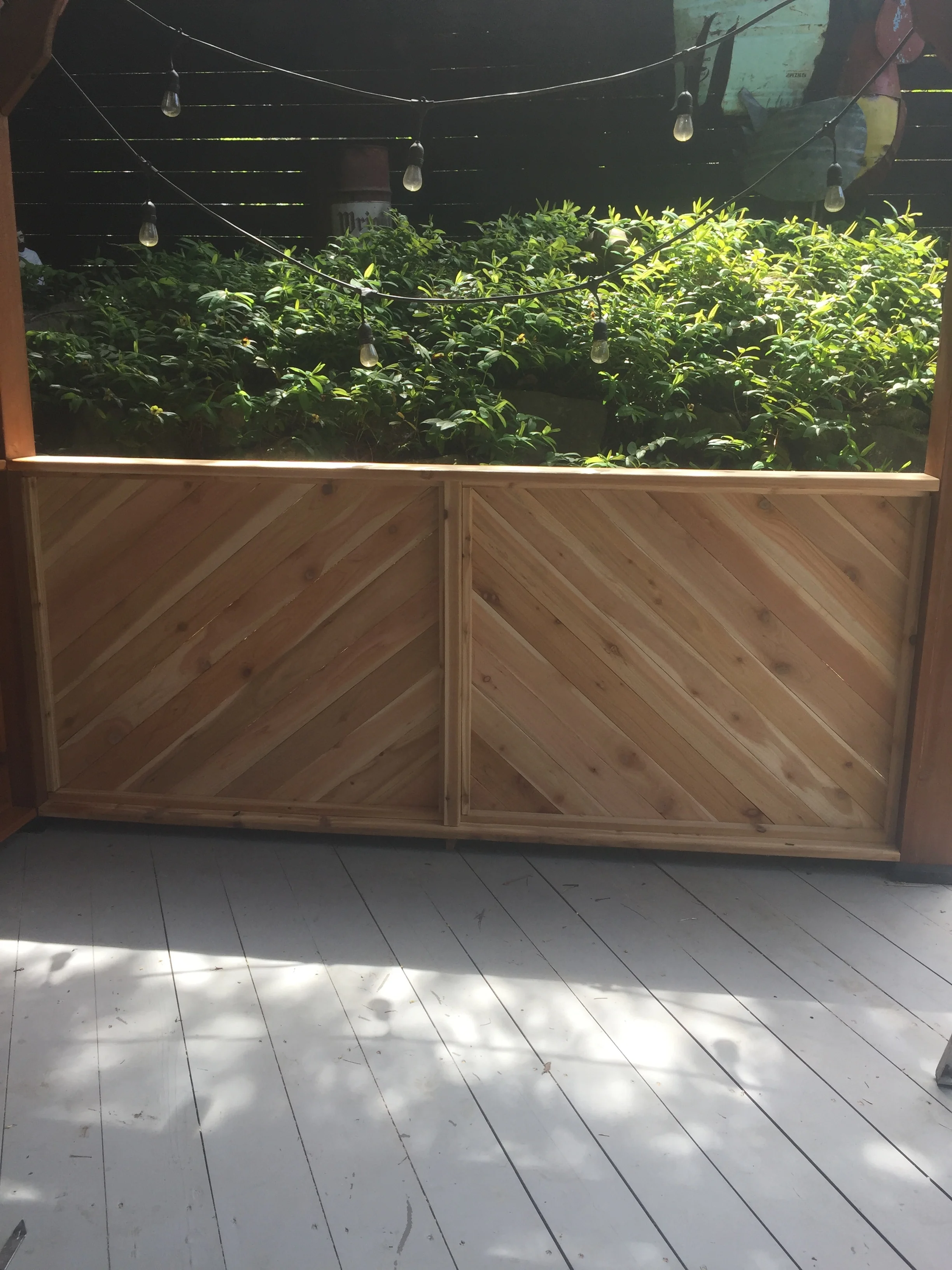 Hand cut, bias design, cedar chair rail from scratch with lattice enclosure for a backyard pergola (May 2018)