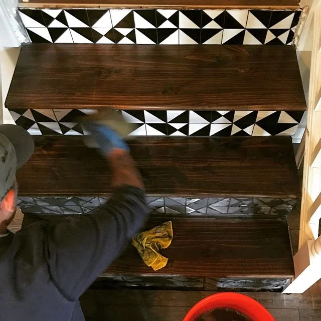 Carpet removal, backsplash staircase and cedar steps in basement (April 2018)