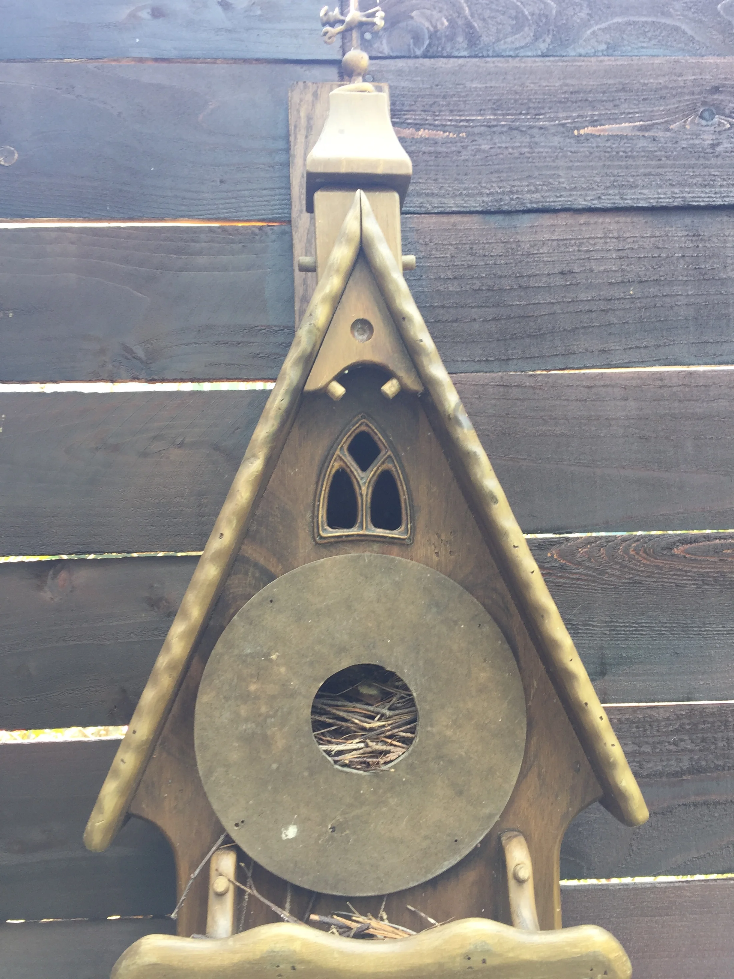 Birdhouse from an antique cuckoo clock. A bird moved in, Ruby named him Chirp (August 2017)